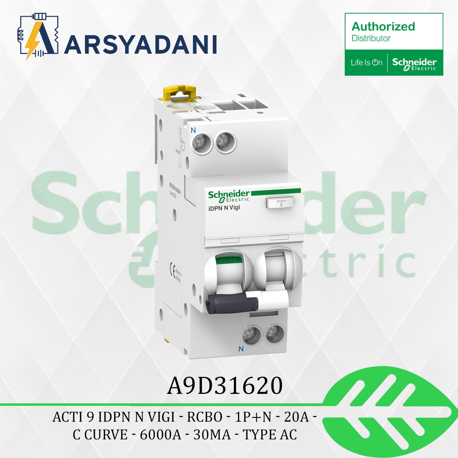 • Informasi Produk:A9D31620 – RCBO – 1P+N – 20A – C Curve – 6000A – 30mA – type AC – Schneider
